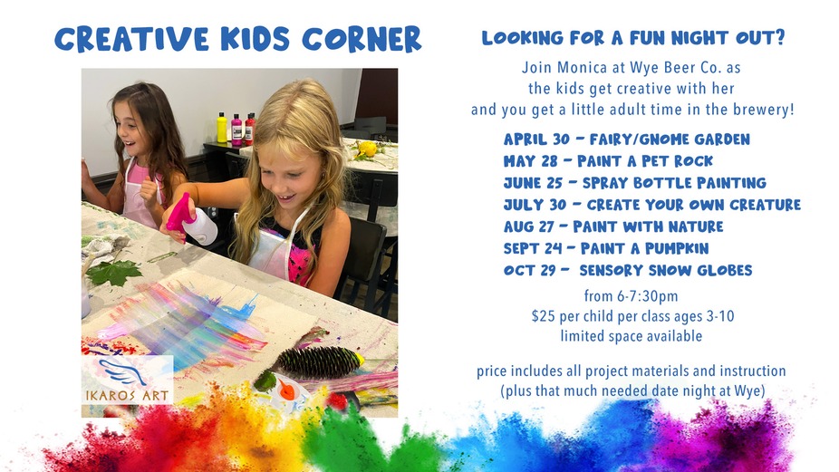Join Monica at Wye Beer Co. where kids will transform simple rocks into adorable painted pets with bright colors and personality. A creative and silly craft they'll love taking home! $25 per child per class ages 3-10 limited space available price includes all project materials and instruction plus a much needed date night at Wye!